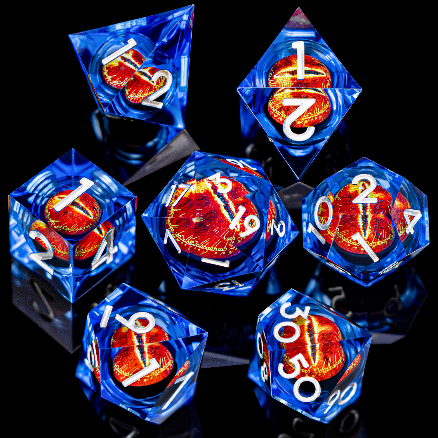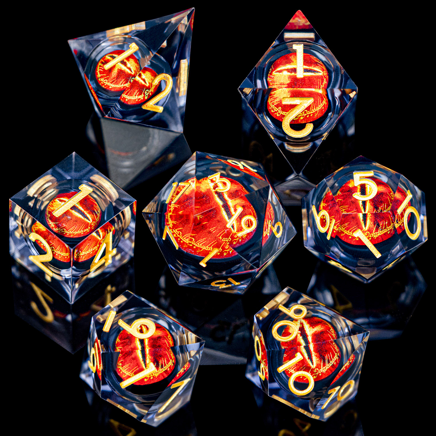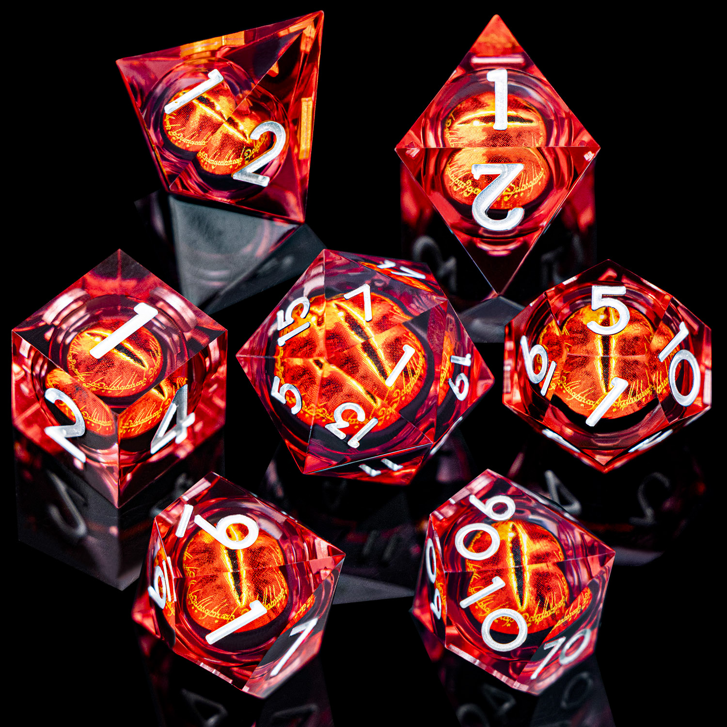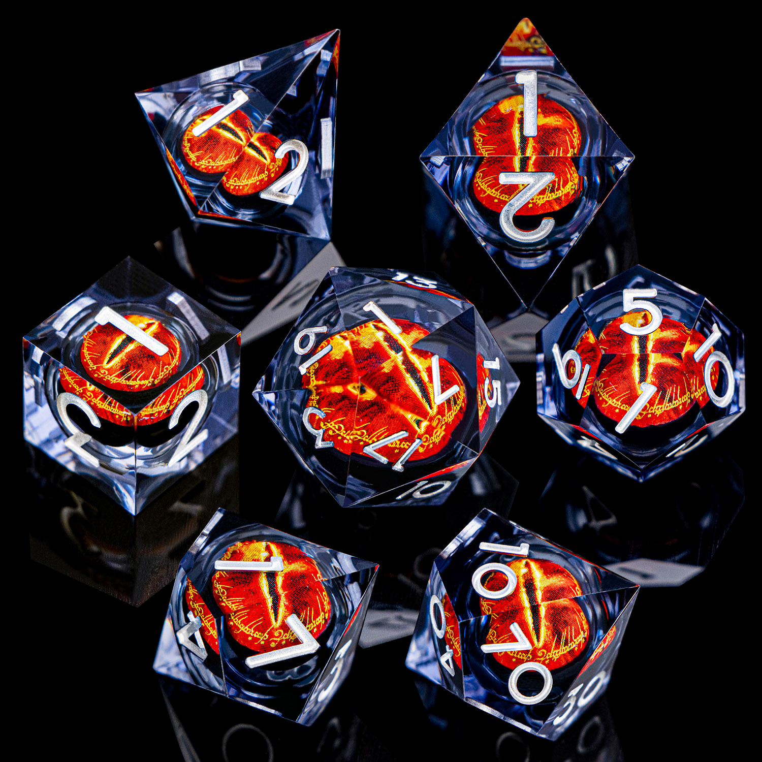 Gaze into the Eye and let fate decide. This stunning set encases a vivid, fiery eye within crystal-clear resin, creating a mesmerizing depth effect that catches light from every angle. Bold red numbering ensures readability while the inner eye watches your every roll. An absolute must-have for fantasy enthusiasts.