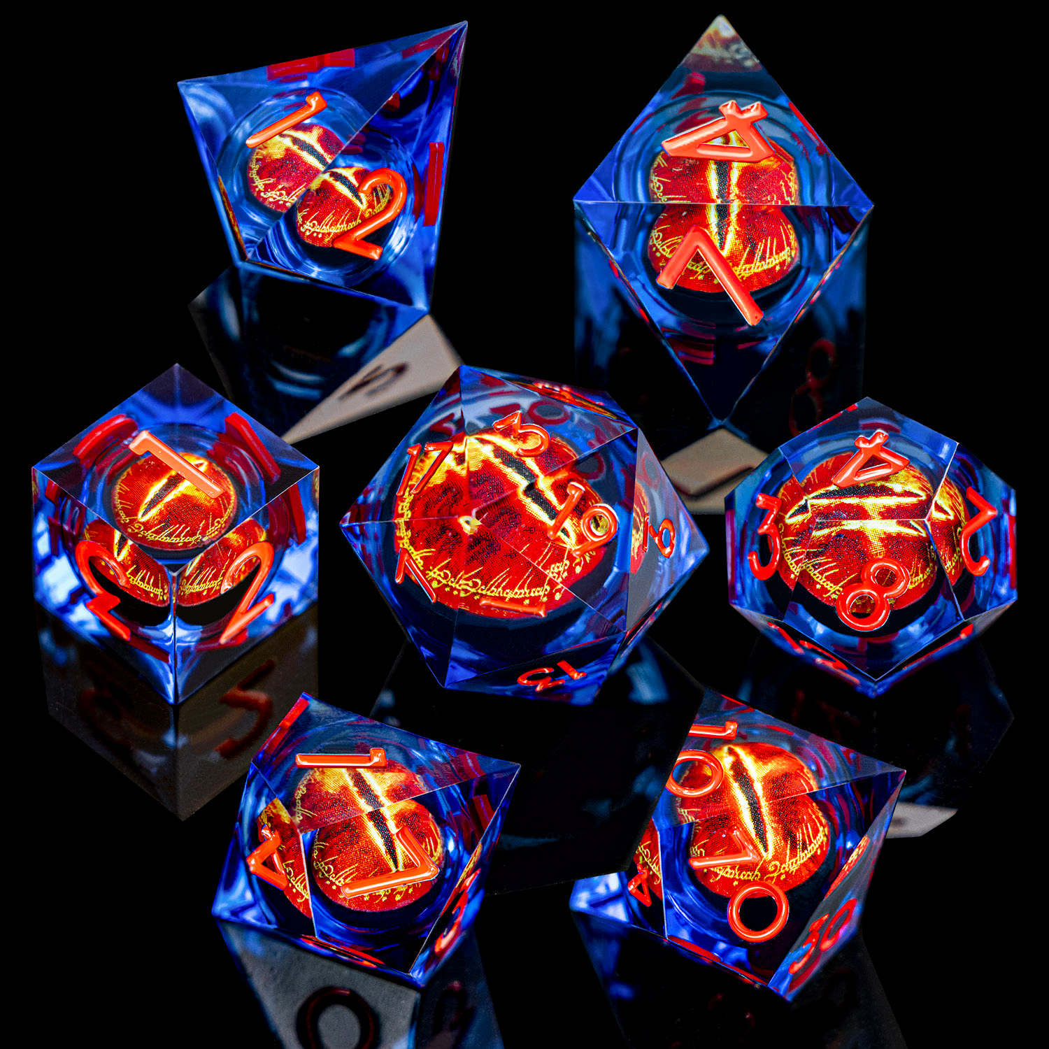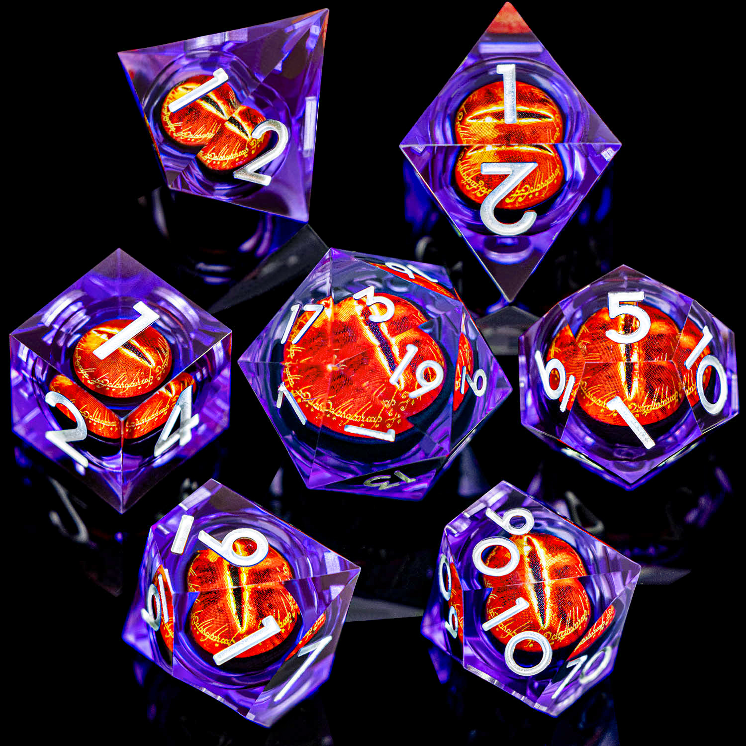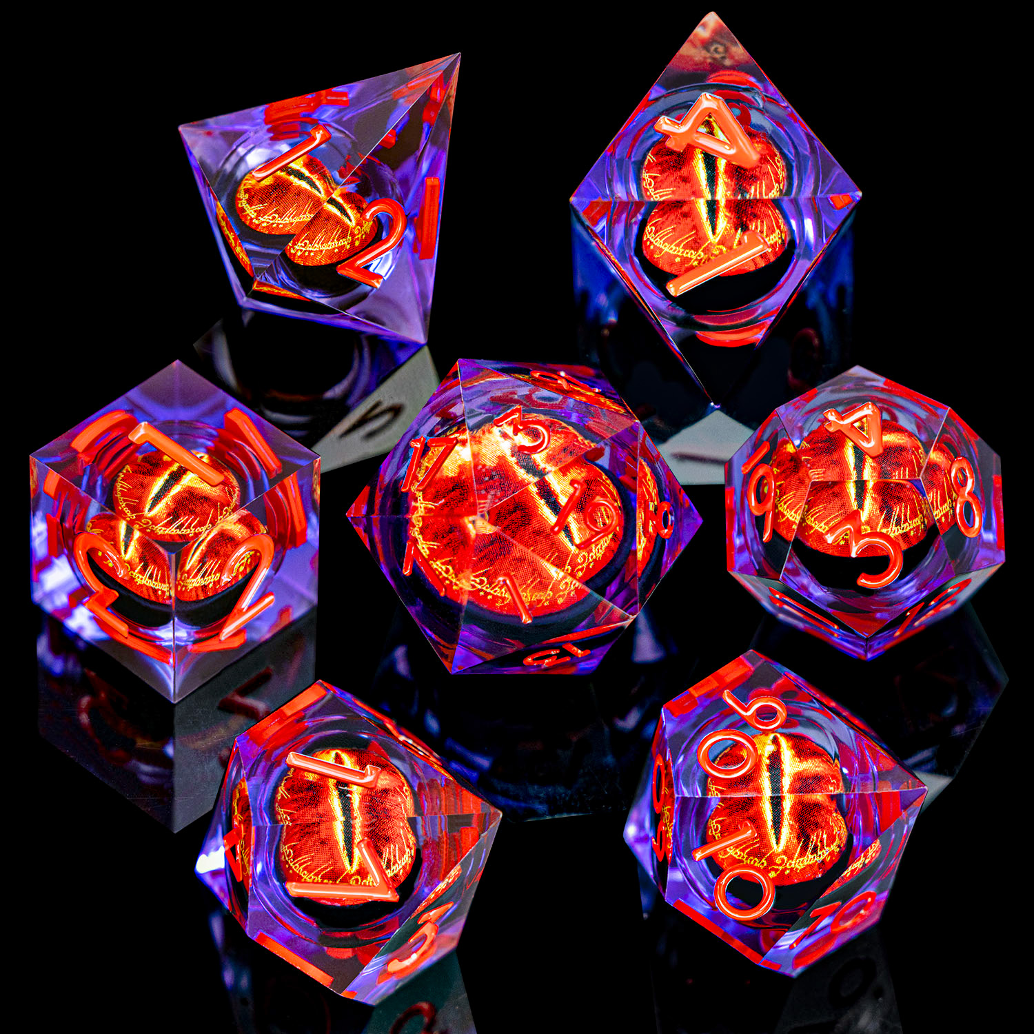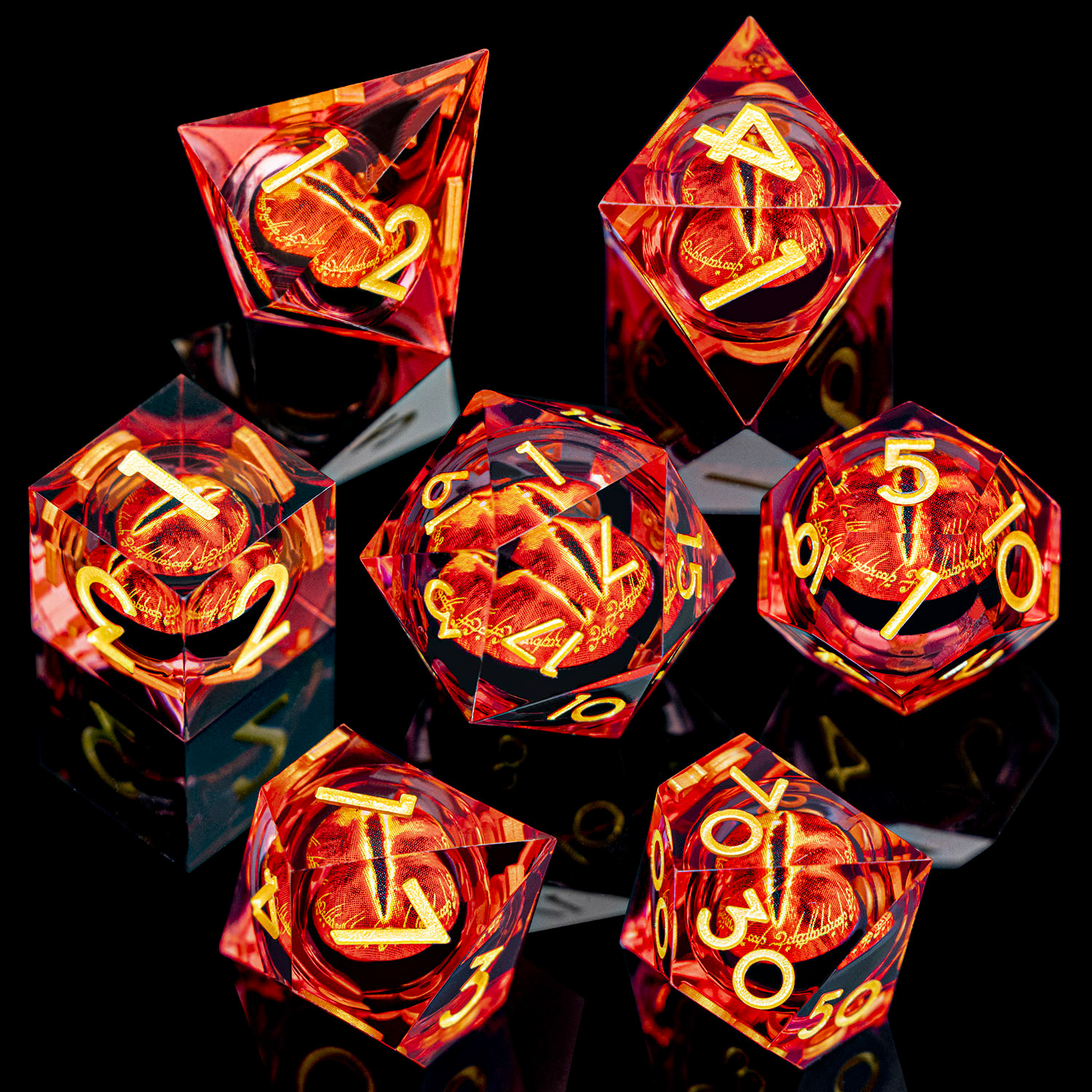 Gaze into the Eye and let fate decide. This stunning set encases a vivid, fiery eye within crystal-clear resin, creating a mesmerizing depth effect that catches light from every angle. Bold red numbering ensures readability while the inner eye watches your every roll. An absolute must-have for fantasy enthusiasts.