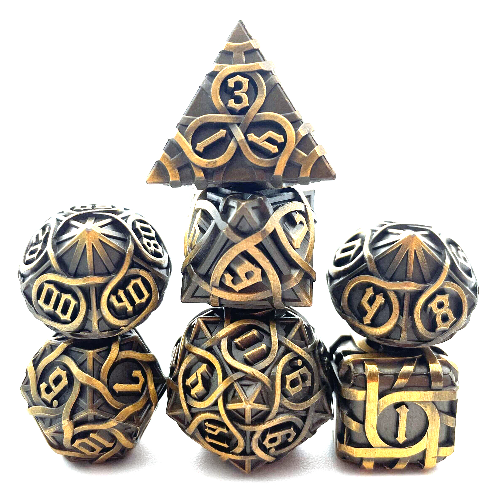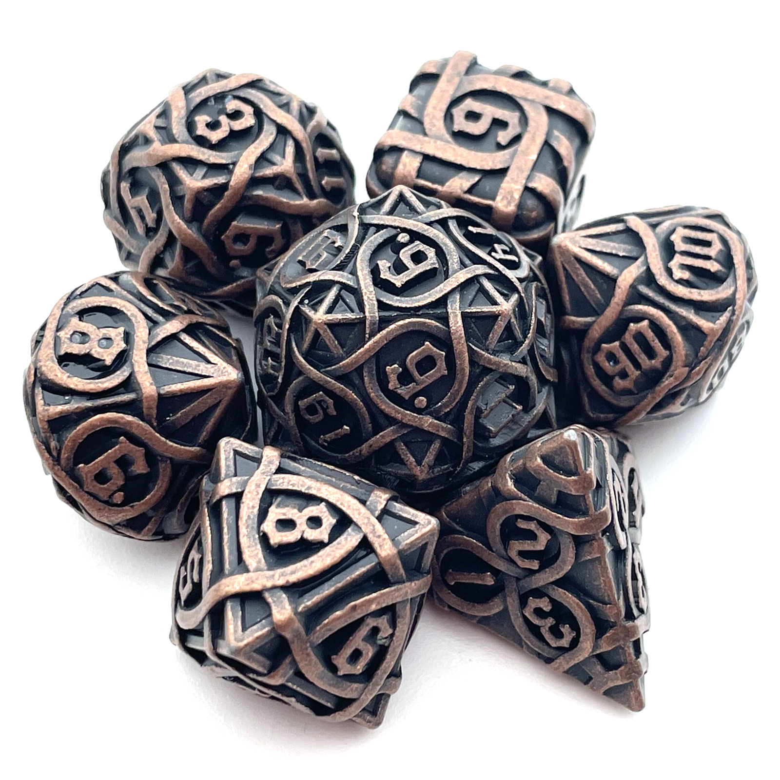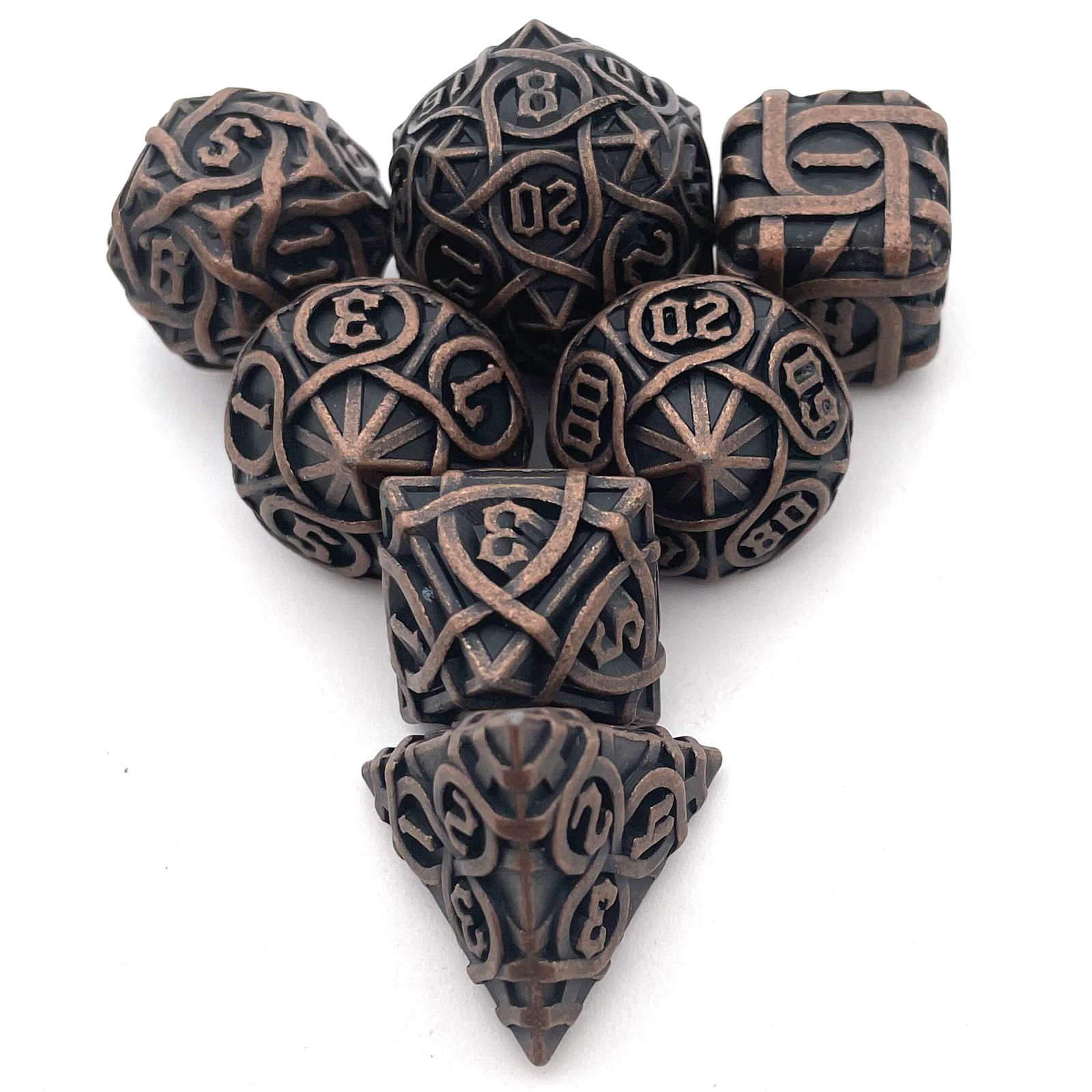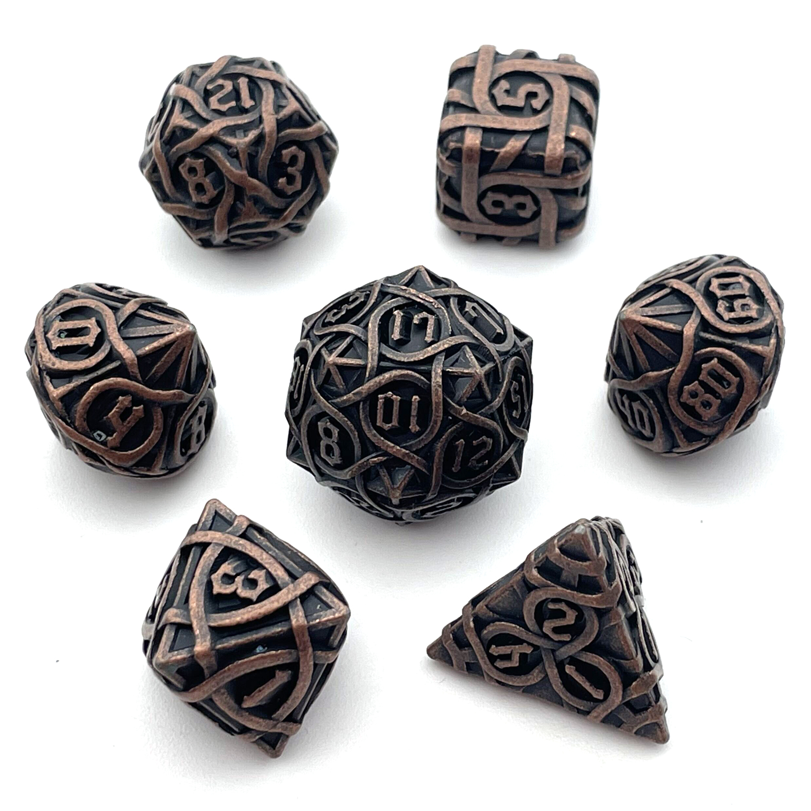Cast from solid metal and hollowed to reveal a breathtaking intertwining maze pattern, these dice blur the line between gaming gear and sculpture. Light plays through the open framework on every face, while the substantial weight delivers a roll with true presence. The Antique Copper finish wears a rich, aged patina that only deepens the drama. Available in nine striking colorways to match your table's aesthetic.