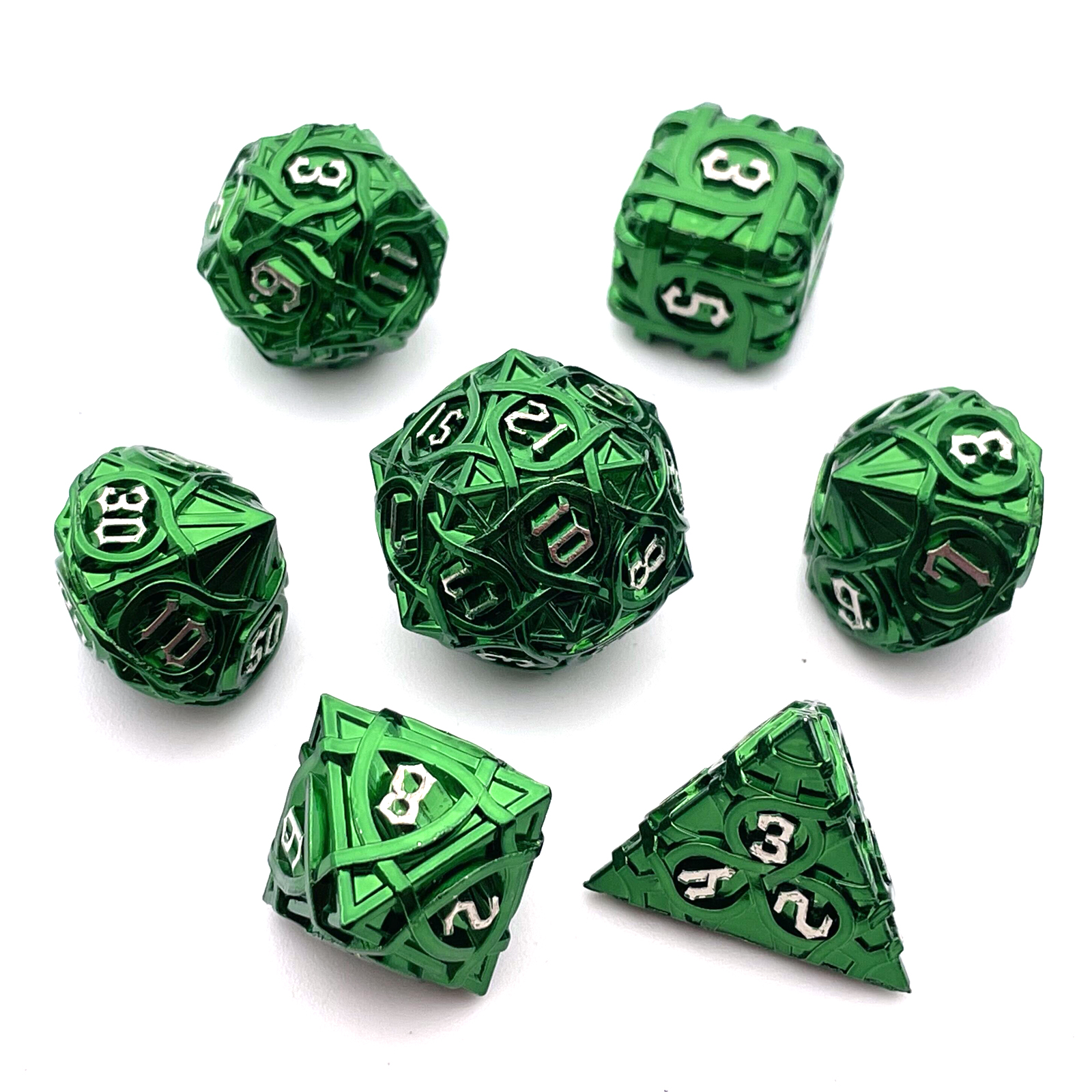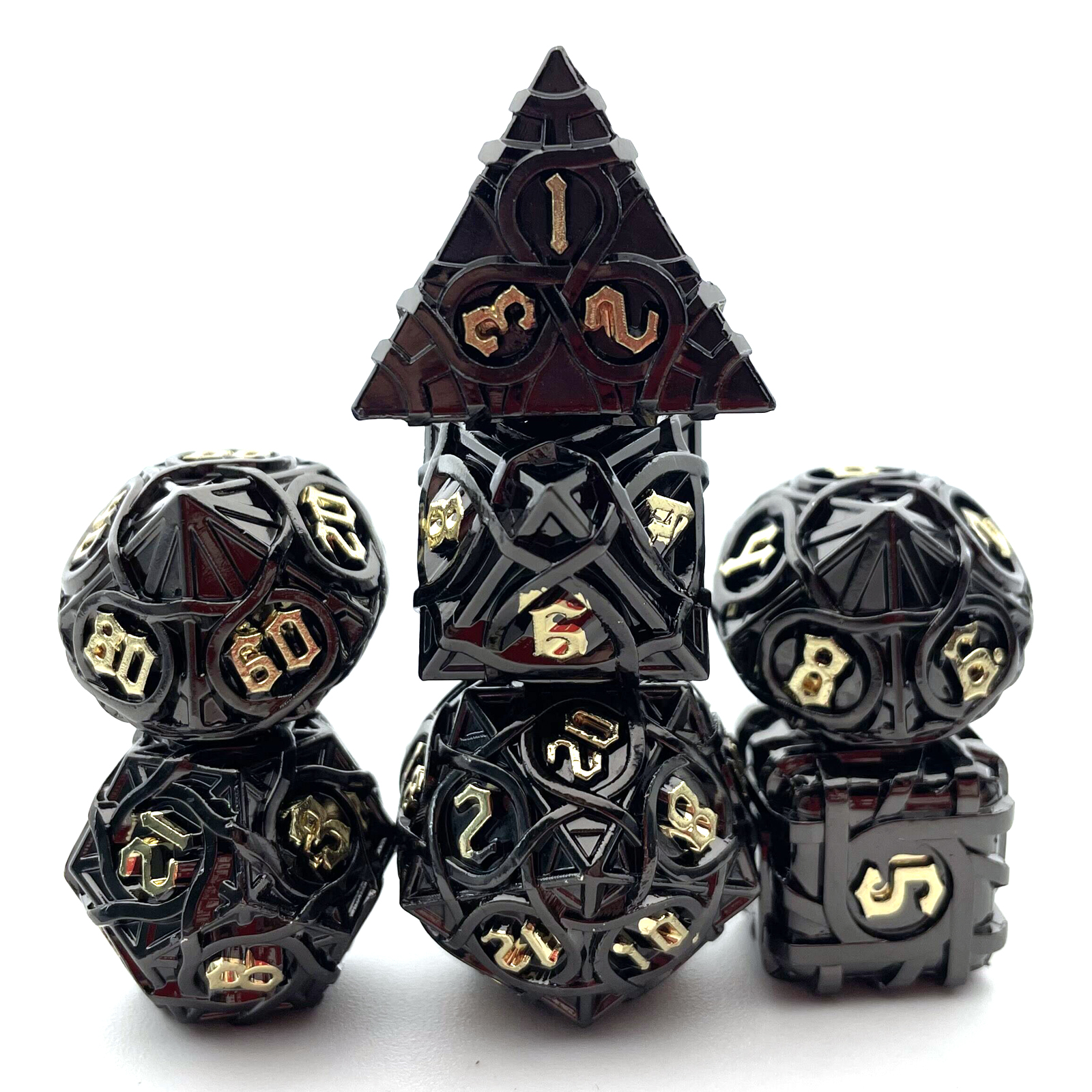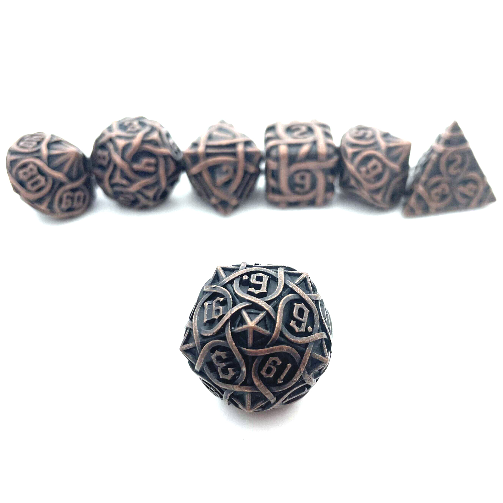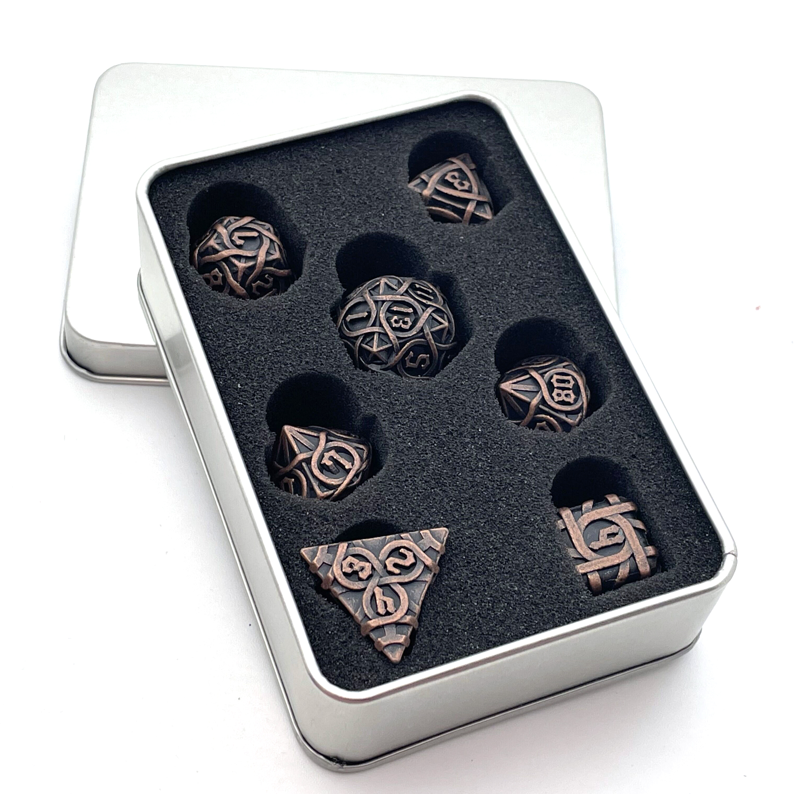 Cast from solid metal and hollowed to reveal a breathtaking intertwining maze pattern, these dice blur the line between gaming gear and sculpture. Light plays through the open framework on every face, while the substantial weight delivers a roll with true presence. The Antique Copper finish wears a rich, aged patina that only deepens the drama. Available in nine striking colorways to match your table's aesthetic.