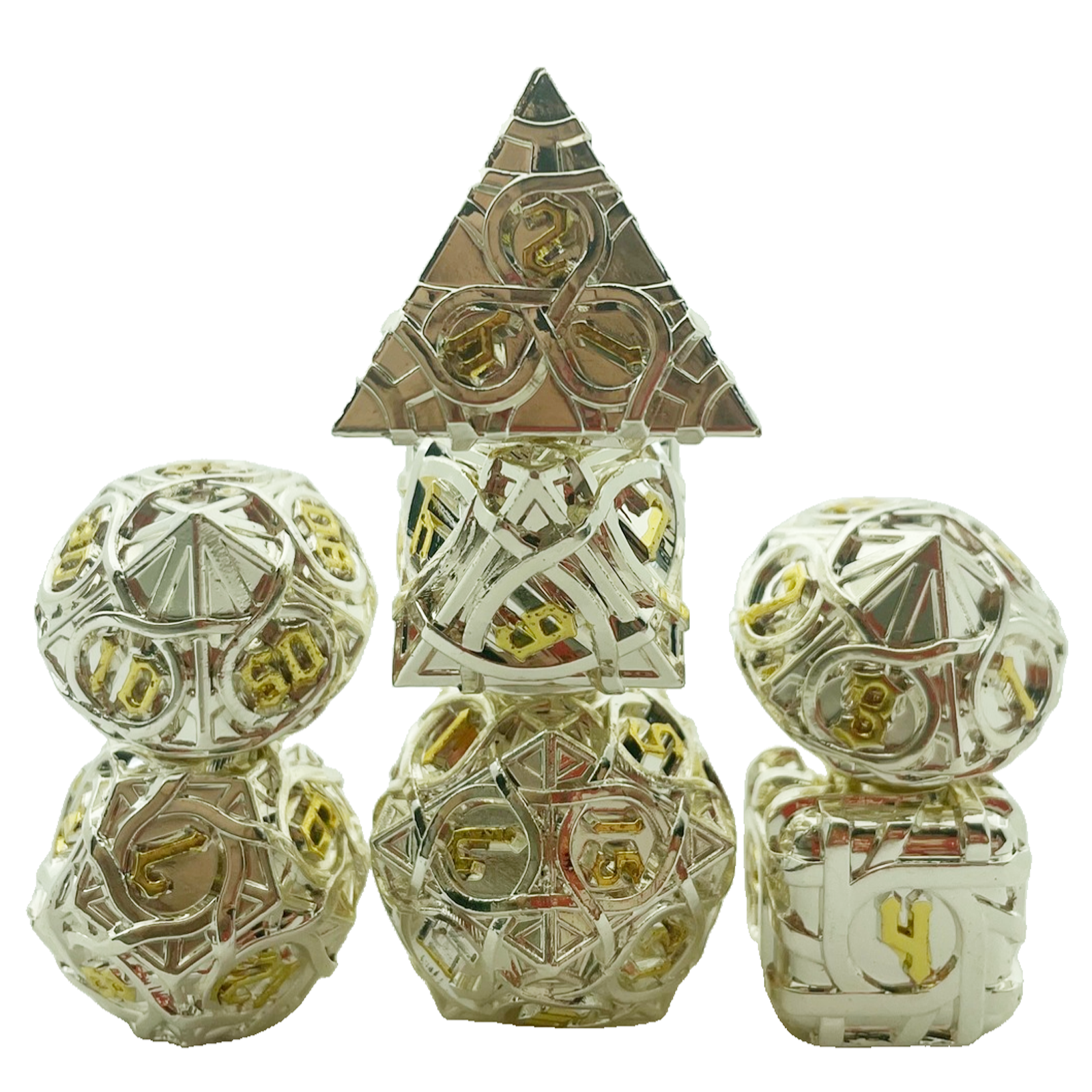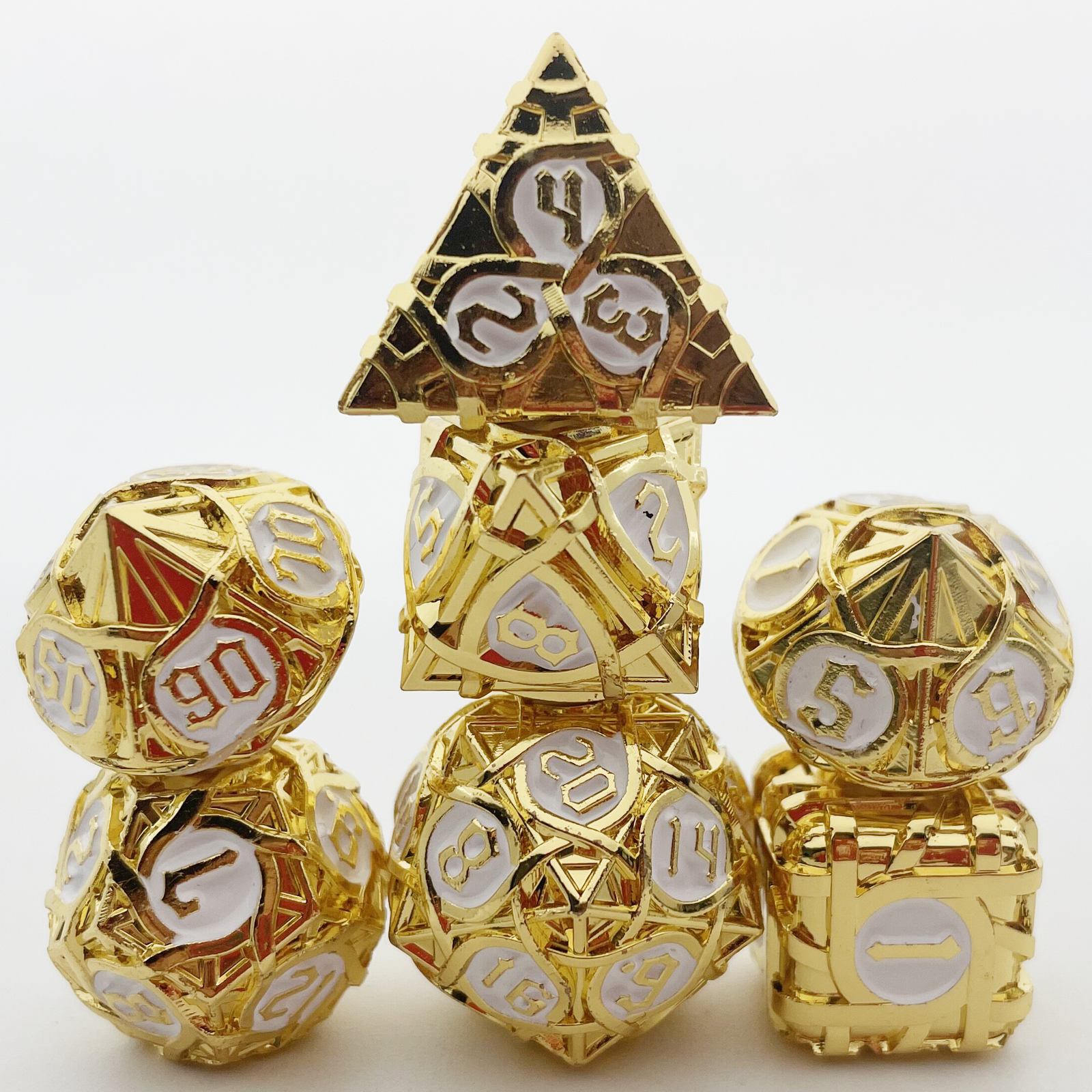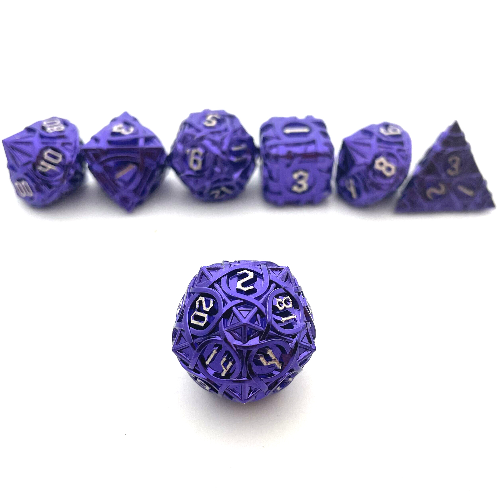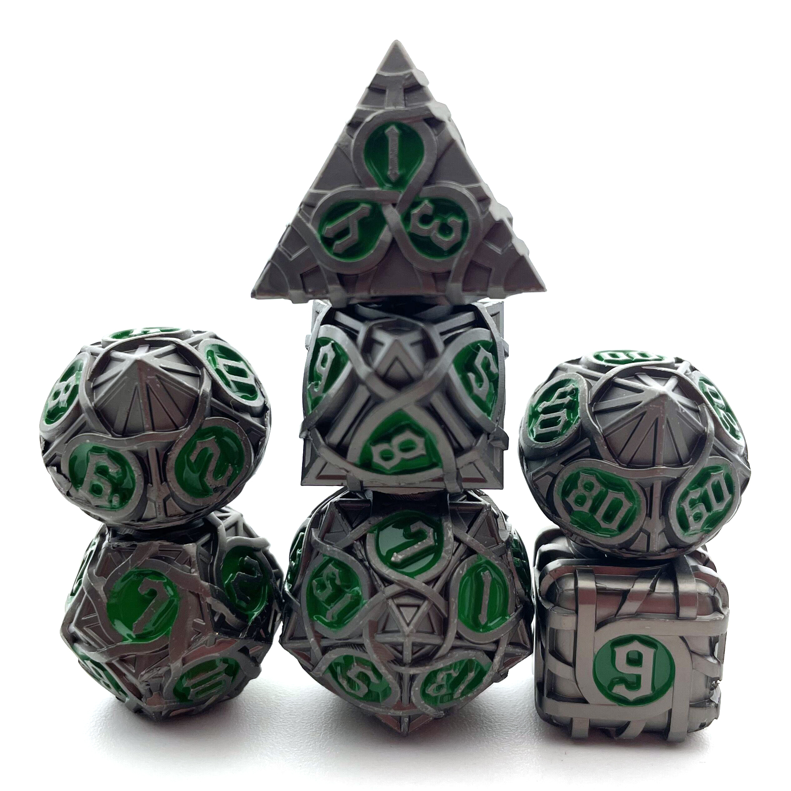 Cast from solid metal and hollowed to reveal a breathtaking intertwining maze pattern, these dice blur the line between gaming gear and sculpture. Light plays through the open framework on every face, while the substantial weight delivers a roll with true presence. The Antique Copper finish wears a rich, aged patina that only deepens the drama. Available in nine striking colorways to match your table's aesthetic.